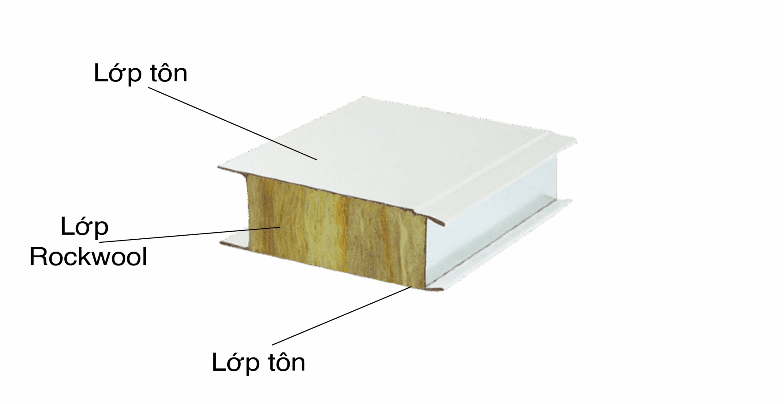 Normally, the 2 outer layers of color-coated steel of the Rockwool insulation panels will be white, but some Rockwool panels are also produced in other colors, this is to meet and suit all customer needs. The 3 layers of the Rockwool panel are firmly connected together by locking the negative and positive joints. Thanks to that, the product is very sturdy and durable, not dented like conventional corrugated iron panels.